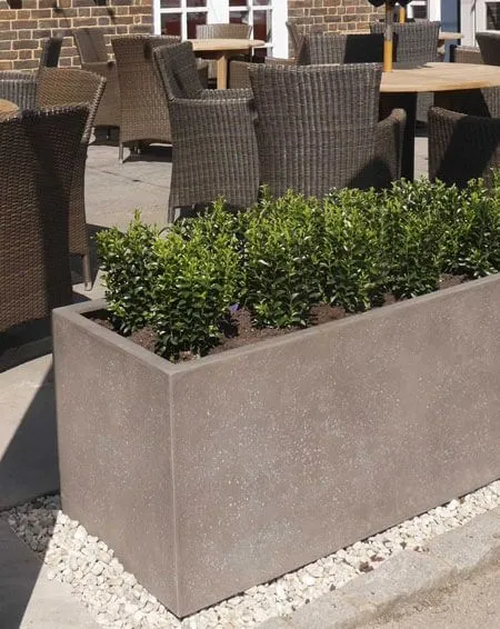 IOTA Florence lightweight concrete trough planters adds a touch of elegance to your outdoor and indoor spaces with its clean lines and slightly weathered look. The mid-grey colour of polished concrete works well with pretty much any colour of exterior.